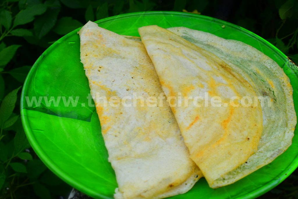Step 4: Heat Dosa pan and pour the flour and make it a thin round. Pour 2 tbsp of oil over the dosa. Once it is cooked, turn to another side.